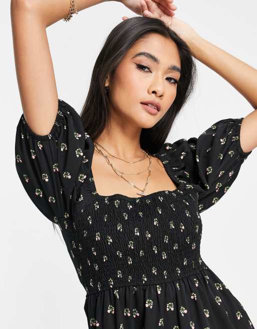 Fashion Union Exclusivit Robe d t courte et fronc e avec manches ballon pour la plage Noir fleurs Very well made.