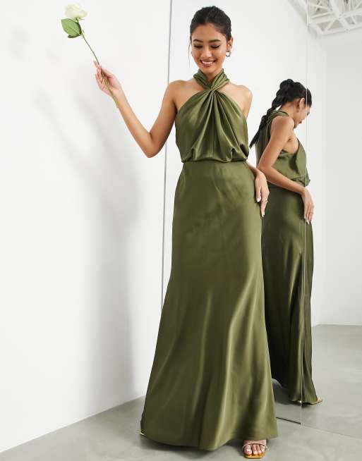 Vestido de dama de honor largo verde oliva con cuello halter fruncido de sat n de ASOS DESIGN Very well made.