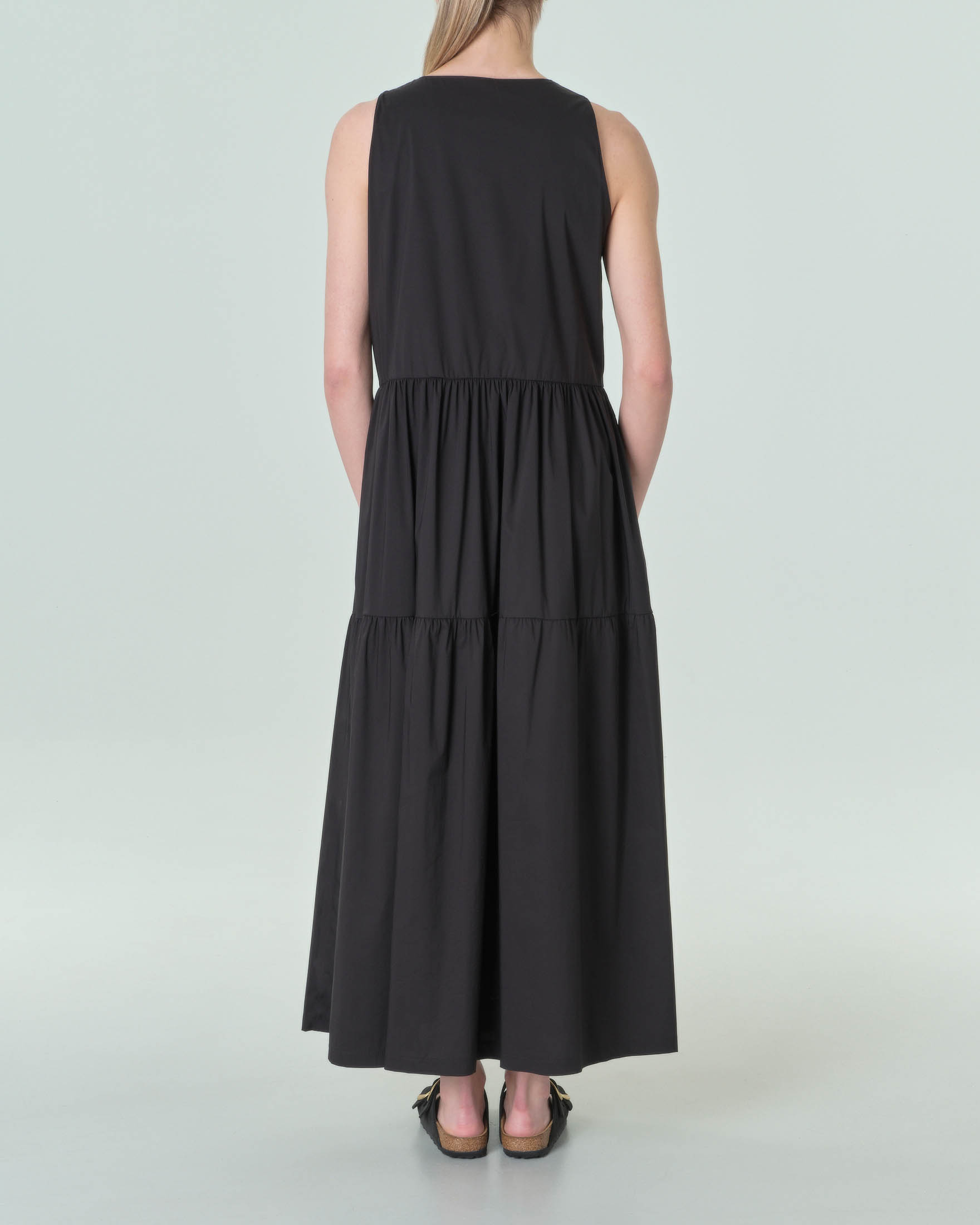 Abito lungo smanicato nero in cotone stretch con gonna a balze e chiusura a serafino davanti Very well made.