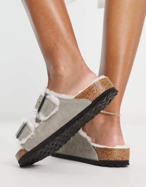 Birkenstock Arizona Sandales plates avec doublure en fausse fourrure Gris Very well made.